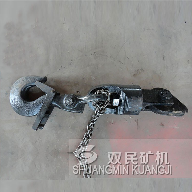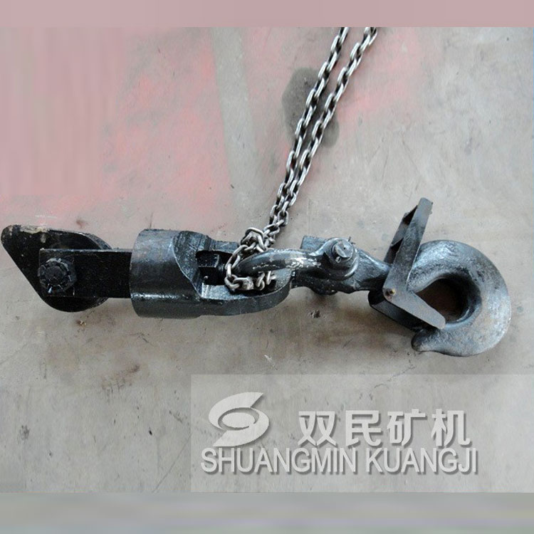 鉤頭及連接裝置,簡稱為鉤頭裝置。 該產品結構簡單,使用性能單一。零件全部由鍛件加工而成,鋼絲繩連接采用了兩種型式,其中5t、7t采用不偏心護繩環,板卡連接;9t